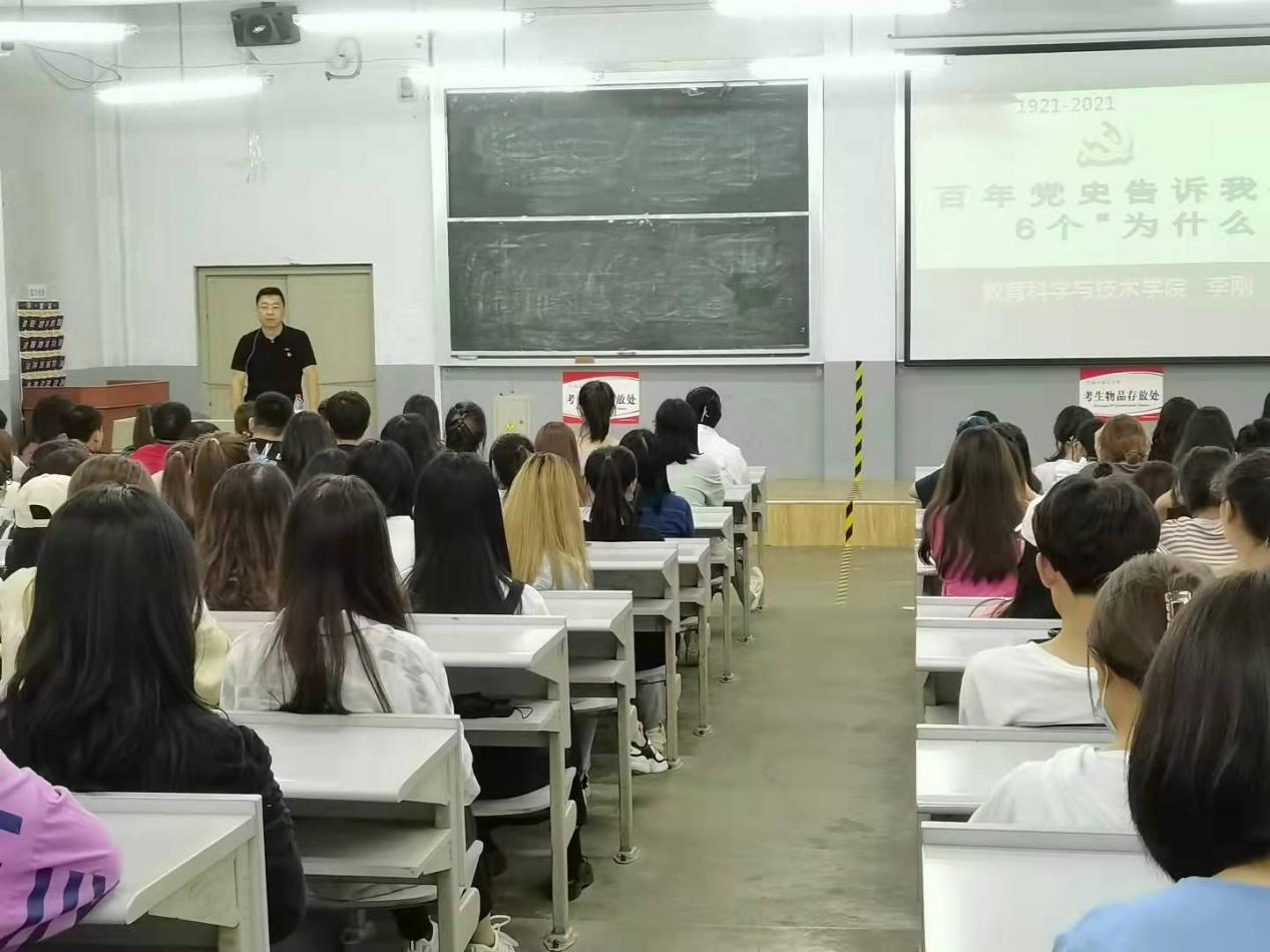 新学期伊始,为继续认真贯彻落实习近平总书记在党史学习教育动员大会上的重要讲话精神,从党的百年伟大奋斗历程中汲取继续前进的智慧和力量,引导学生坚定不移听党话、跟党走,有效提升教育科学与技术学院学生党史学习的积极性和有效性,推动学习教育活动走深走实。9月9日,教育科学与技术学院党总支书记李刚在新合教室103,开展了以《百年党史告诉我们6个“为什么”》为主题的开学第一堂思政课,学生支部书记刘莹莹老师为大家做开场主持。