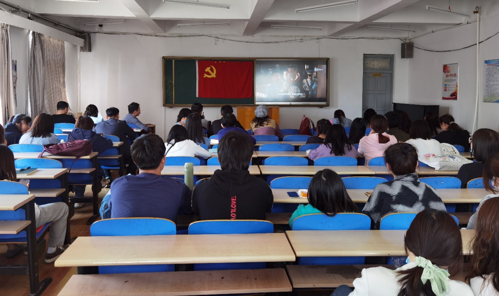 2021年5月10日,教科院党总支组织全体党员教师在教科楼406观看红色经典记忆系列电影之一——《建党伟业》。