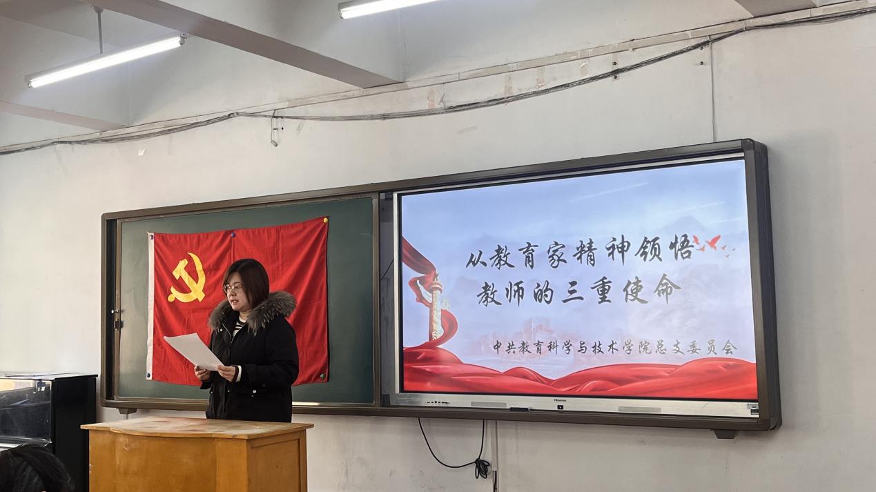 2025年1月10日,在教科院406教室,召开“从教育家精神领悟教师的三重使命”主题党日活动,活动由陈巍领学。活动过程中,陈巍同志以生动且严谨的方式,为大家深度解读教育家精神,教师们全神贯注,认真聆听、记录,积极与讨论交流,分享自己的见解与感悟。