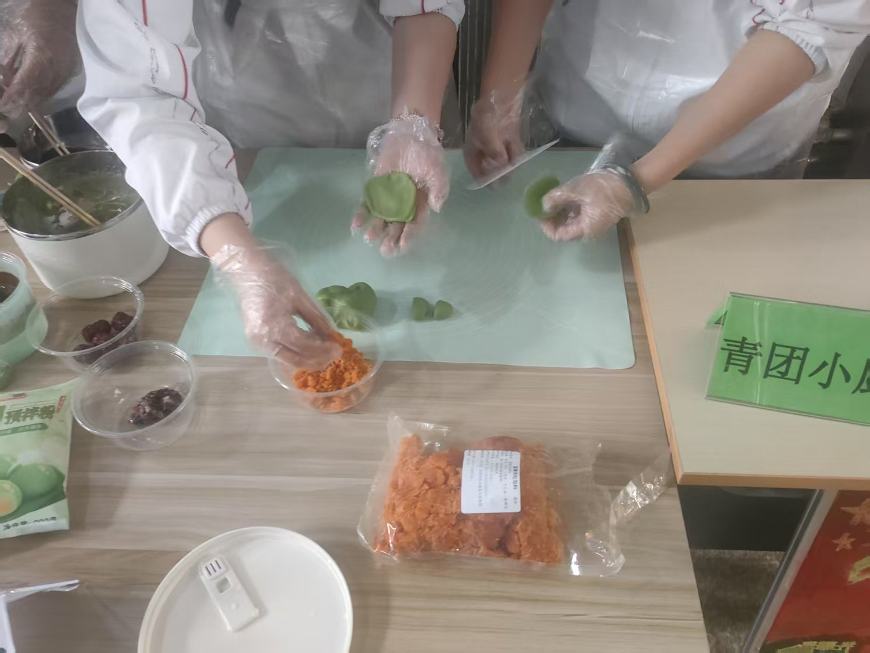 通过与清明节和青团制作相关的板报,营造出了浓厚的节日氛围。随后组织者向大家明确了活动的流程和注意事项,并为大家发放了口罩和一次性手套。同学们分成不同的小组,开始动手制作青团。现场欢声笑语不断,大家在动手制作的过程中不仅体验到了传统手工艺的魅力,而且也加深了对清明节文化内涵的理解。