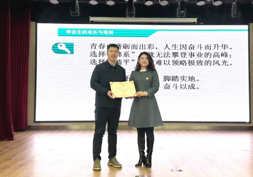 讲座结束后,学院领导为丁超校友颁发了“校外实践指导教师”和“校外辅导员”的聘任书。丁超校友从深耕基层教育的奋斗者,转身成为师范生成长路上的引路人。他二十余年的教学管理智慧与躬身实践的治学精神,将通过课堂指导、教案研讨、实习督导等形式,倾力搭建“学以致用”的实践平台,帮助学子实现从“合格学生”到“卓越教师”的蜕变。丁超校友的加入是推动教学与实践深度融合的重要举措,将助力师范生在真实教育场景中锤炼“站稳讲台”的能力。