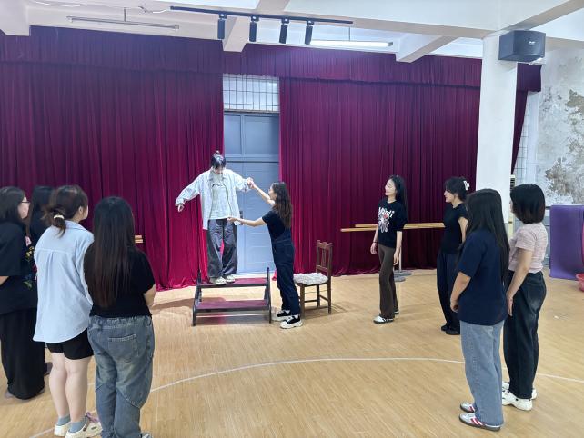 发声训练:发声训练由李宛庭负责。发声是戏剧表演基础,她从呼吸练习引导成员感受气息控制,让成员学会腹部呼吸,使声音沉稳有力。接着通过发音练习纠正成员发音问题,让吐字清晰准确。绕口令、诗词朗诵等环节增加趣味性,提升成员语言表现力,助其传达角色情感。