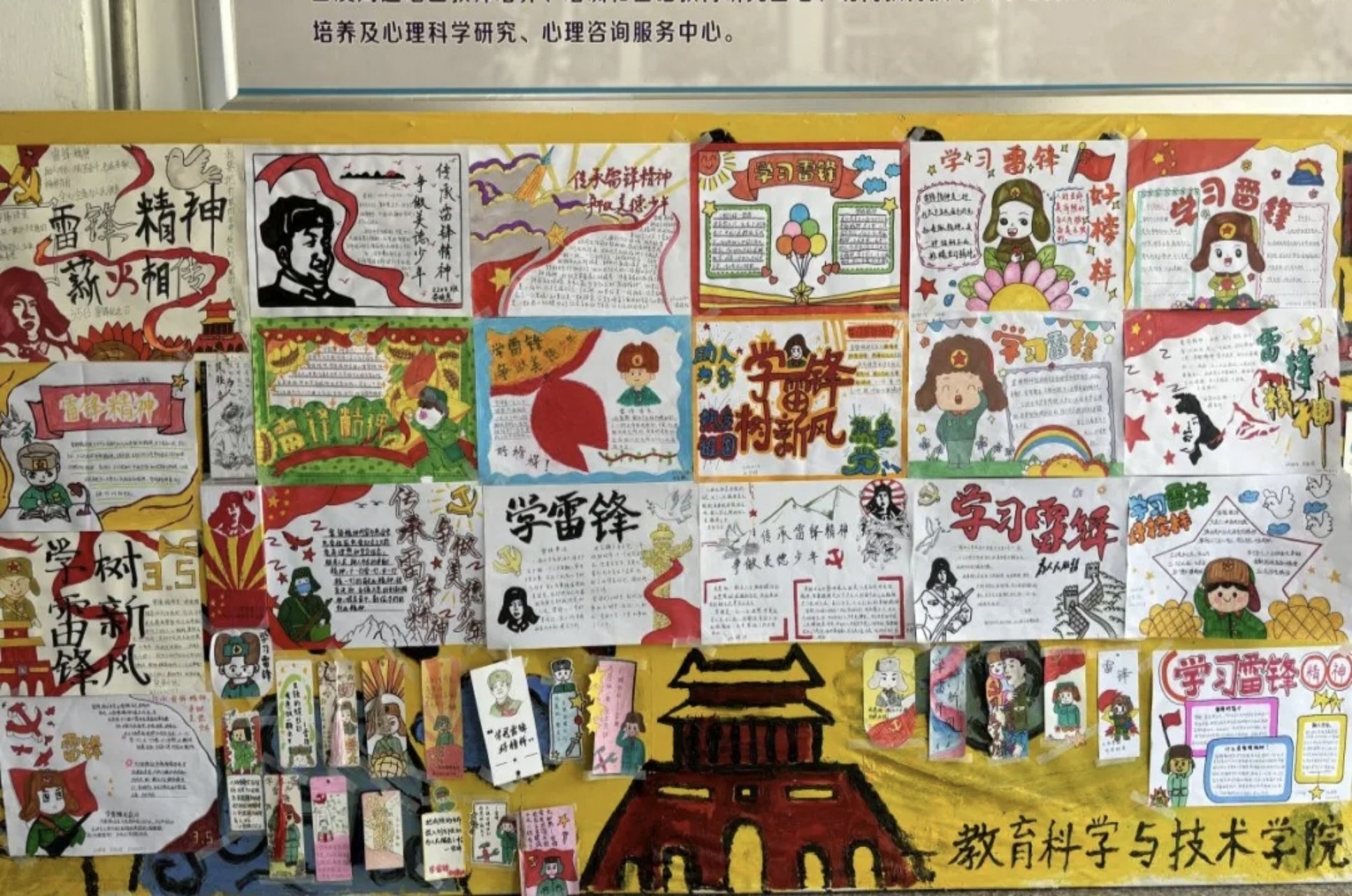 为促使学生自觉主动地在学习生活中时刻关注雷锋精神,长期形成学雷锋的氛围,在教育科学与技术学院组织下,开展了“传承雷锋精神,争做美德少年”主题手抄报、书签制作活动。同学们积极投稿,以图文并茂的形式,从各个方面再现雷锋故事和自己身边的好人好事。同学们把对雷锋的崇敬和怀念之情深深融入到手抄报创作之中。