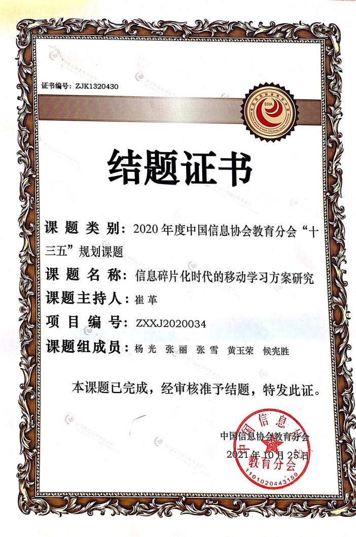 2.在2021年2020年度中国信息协会教育分会“十三五”规划课题通过结题。