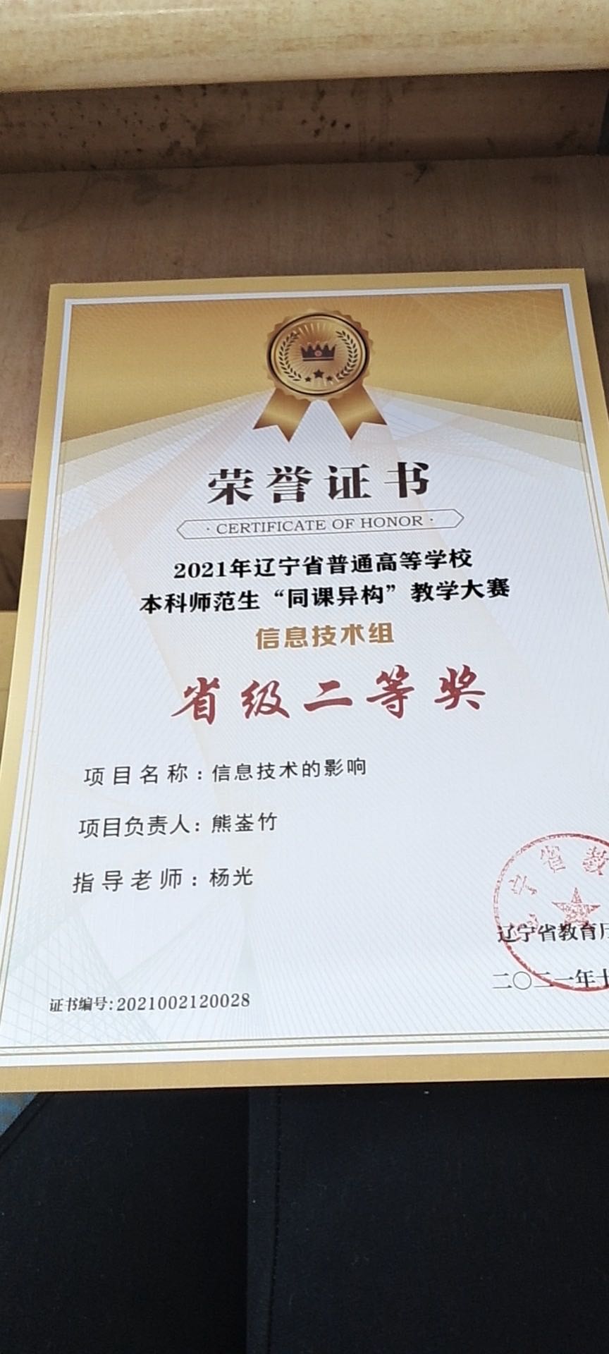 5.在2021年指导学生于辽宁省普通高等学校本科师范生“同课异构”教学大赛荣获省级二等奖。