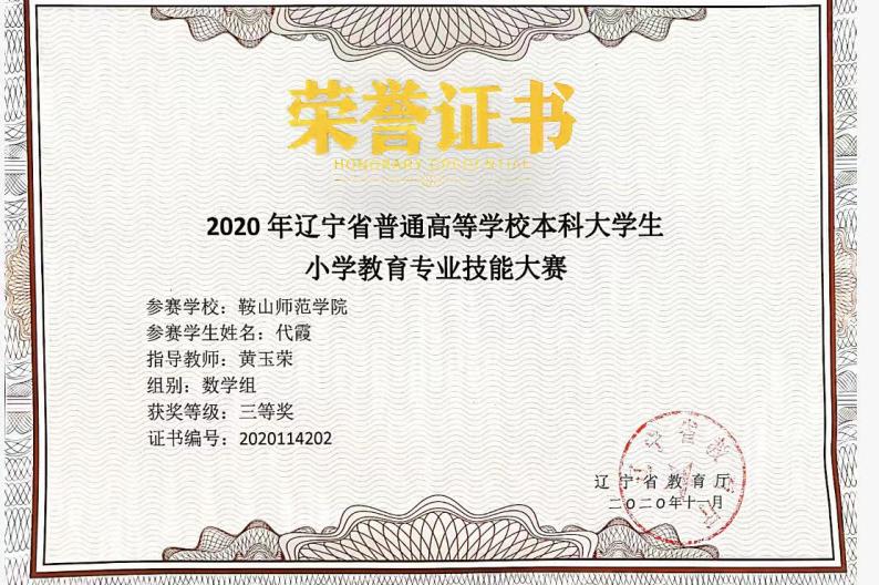 6.在2020年指导学生在辽宁省普通高等学校本科大学生小学教育专业技能大赛荣获三等奖。
